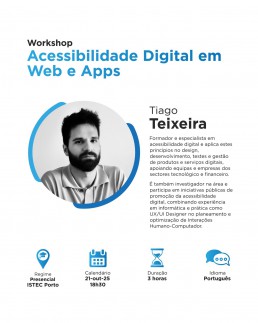 Este workshop tem como objetivo introduzir os princípios e as boas práticas de acessibilidade digital no contexto do design e desenvolvimento de websites e aplicações.