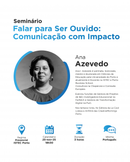 - Ana I. Azevedo é polímata, licenciada, mestre e doutorada em Ciências da Educação pela Universidade do Porto e atualmente é Docente no ISTEC e PortoBusiness School,